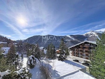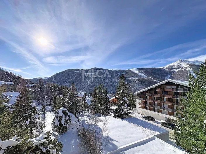 On the first level, an entrance hall with a large closet leads to a shower room with a window overlooking the Col de la Bonnette mountain pass, a separate Wc, and an open-plan fitted kitchen/living room with a wood-burning stove and access to a south-facing terrace offering panoramic views of the surrounding peaks.
