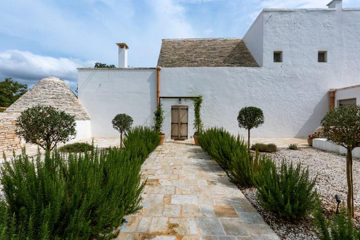 Original architectural details—such as soaring trulli ceilings with exposed wooden beams—frame a serene interior courtyard that opens onto well-tended grounds. Here, centuries-old olive trees and fragrant Mediterranean flora create a landscape of extraordinary beauty and tranquillity.
