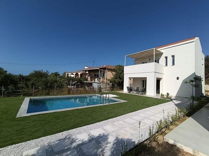 Just 800 meters from the sandy beach of Dramia, this newly built 80 sq.m. maisonette (2025) sits on a private 500 sq.m. plot, offering comfort, privacy, and excellent investment potential. Arranged over two levels, it features two ground-floor bedrooms with direct access to the terrace and private 30 sq.m. swimming pool, plus a spacious bathroom and storage area. The upper level offers a bright open-plan living, dining, and kitchen area, a second bathroom, and a sea-view veranda ideal for outdoor living. Equipped with aluminum double-glazed frames, insect screens, tiled floors, air conditioning in all rooms, solar water heating, private garden, and parking, this property is perfect as a holiday home, permanent residence, or high-yield rental investment near Georgioupolis, Rethymno, and Chania.