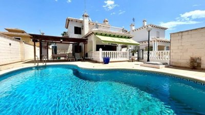 Detached chalet located in one of the most popular areas of Orihuela Costa, La Zenia, just 400m from the beach. Built on a 453m2 plot, the two-story home has approximately 150m2 of living space. On the ground floor, we find a spacious and bright living-dining room with a fireplace, a semi-independent kitchen, two double bedrooms, one bathroom, and a laundry room. There is a spacious front porch. On the first floor, there are two more bedrooms and another bathroom. From the master bedroom, there is access to the approximately 20m2 terrace. The home faces south. It has a 28m2 private saltwater pool. The basement includes a closed garage. Sold furnished. Close to all necessary services, a wide variety of bars and restaurants, it is an ideal location for year-round living or a wonderful holiday. La Zenia Beach is less than a 10-minute walk away. La Zenia Boulevard Shopping Center is a 5-minute drive away.