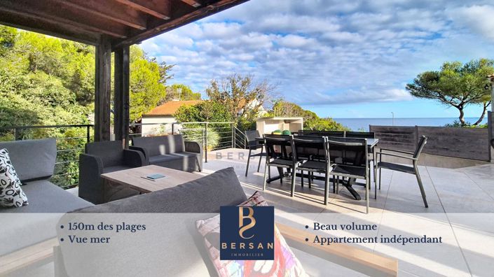Your agency Bersan Immobilier presents this villa located just steps from the sea, enjoying a privileged and rare location in the area. You will discover a spacious property, offering great brightness and a large living room opening onto a wide terrace with a pleasant unobstructed view of the sea, a ground-floor bedroom with an ensuite shower room, two bedrooms on the upper floor facing the terrace overlooking the sea, one of which has a private shower room, an independent shower room, a bedroom with a dressing room, and an office. A beautiful independent apartment with its own entrance, ideal for hosting or considering rental income. A cellar and parking spaces complete this property. An exceptional property, offering volume, immediate proximity to the beaches, and great potential. The entire Bersan Immobilier team remains at your service to provide you with further information.