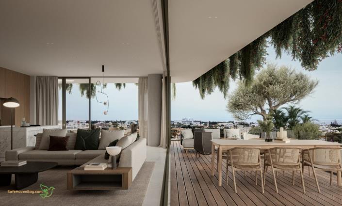 The penthouse offers approximately 196 sqm total area, including 131 sqm covered internal space and a 31 sqm covered balcony with unobstructed sea views. The open-plan living and dining area connects directly to expansive covered terraces, creating a seamless indoor–outdoor flow suited for both private relaxation and entertaining.