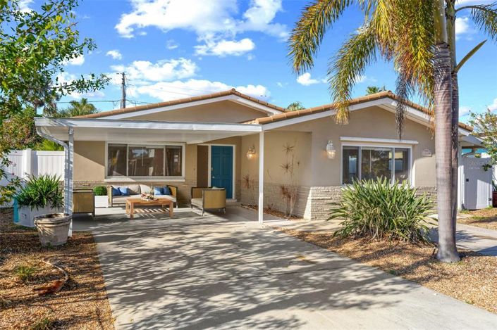 One or more photo(s) has been virtually staged. Welcome to coastal living at its finest in Treasure Island’s desirable Isle of Palms neighborhood. This beautifully updated single-story home offers modern efficiency, relaxed island charm, and exceptional walkability. Spanning approximately 1,465 square feet, this three-bedroom, two-bath block residence blends solid construction with thoughtful renovation. The updated kitchen features new GE stainless steel appliances, Quartz countertops, a designer backsplash, and classic shaker cabinetry that balances style and function. A rare highlight is the seamless indoor–outdoor flow. Each bedroom includes its own private door leading to patio areas, creating ideal spaces for morning coffee, guest privacy, or quiet lounging. The fully fenced backyard enhances the sense of retreat and provides a serene setting to unwind. Recent improvements include a new metal roof (2024), new LG energy-efficient HVAC system, new clothes washer and dryer, recessed lighting throughout, hurricane shutters, window blinds throughout, and ceiling fans in the living room and bedrooms. The primary bath features a beautifully tiled walk-in shower, and tile flooring throughout offers durability suited for beachside living. Plenty of parking for your guests, with a covered front of the home patio/carport and two paved driveways. Located just 262 feet from the Isle of Palms community park with playground and a six-minute walk to the Beach Trolley for convenient travel along Gulf Boulevard, this property offers comfort, resilience, and flexible use as a primary residence, second home, or income-producing coastal retreat. All measurements are approximate and provided for marketing purposes; buyers are encouraged to independently verify room dimensions and overall square footage. Prospective purchasers should also confirm short-term rental regulations, zoning requirements, and any applicable municipal or county guidelines directly with the appropriate governing authorities. Property is offered unfurnished. Some images have been virtually staged for illustrative purposes. Also available for annual lease (unfurnished).
