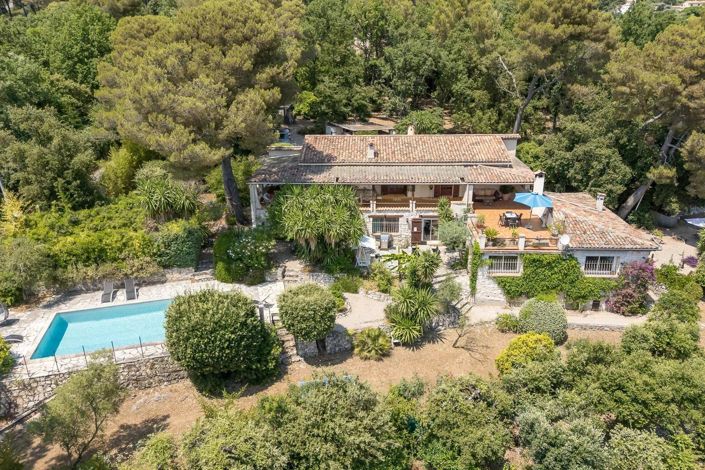 Just a few minutes from the village, this superb, stone-fronted, 262 m² farmhouse is nestled in a 2,800 m² green setting with swimming pool, in absolute peace and quiet, with panoramic views stretching to the sea, the Cap d’Antibes, and the Tanneron mountains.