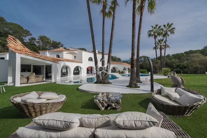 Completely renovated in 2025, the villa enjoys a south-facing exposure and total privacy, with no overlooking. It is set on a magnificent flat landscaped plot of approximately 3,280 sqm, enhanced by a swimming pool with organic lines, a distinctive feature inspired by Couelle’s architectural style.
