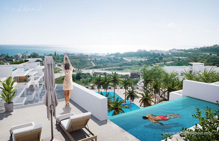 New complex in the popular residential area of Arroyo de Enmedio, close to Estepona. The complex is only five minutes from Estepona’s historic centre and three minutes from its marina. The area is ideally connected by motorway to other major cities, like Marbella which is only 20 minutes away. There is a large selection of daily amenities available likes supermarkets, shops, petrol stations, pharmacies, as well as the Estepona High Resolution Hospital. An area with all the conveniences of a city, and an idyllic environment with numerous beaches.Apartments with 2 and 3 bedrooms, in different models: ground floor apartments with a garden; and penthouse apartments with private solarium. The apartments offer the perfect combination of comfort and quality. A key feature of Mediterranean design are the large terraces, allowing for maximum light, with the combination of pergolas to provide shade. Depending on the orientation of the apartment, the terraces enjoy beautiful views of the Mediterranean, or views of the surrounding mountains. The interior design of the apartments is bright and spacious.The community areas are designed with beautiful gardens, a large swimming pool for adults and children, a gym, and a Spa.The apartments have fully equipped kitchens with white goods, as well as a parking space and storage room.