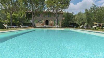 Finally restored, traditional stone casale with stunning features, air conditioning, pool, olive grove, priavte setting, for sale in Cortona. Prime location close to the border between Tuscany and Umbria, this early 1800s former country house stands in a secluded position with open agricultural vistas over the Valdichiana countryside, just minutes from Cortona historic center and amenities. Meticulously restored in 2010, the villa offers 385 square metres (4,144 sq ft) of living space arranged over two principal floors, complemented by a traditional basement cellar, and set within a private plot of 9,600 sq m (2.3 acres). The renovation preserved the historic fabric of the building while introducing modern comforts with great sensitivity. Original stone façades, terracotta floors and exposed wooden beams remain central, complemented by stone fireplaces and high ceilings that imbue the interiors with warmth and a sense of timeless rural elegance. Windows and doors have been entirely replaced with double-glazed frames, finished in harmony with the traditional sage-green wooden shutters characteristic of Tuscan country houses. The ground floor opens into a welcoming entrance hall leading to a generous reception room and a refined double living arranged around a striking stone fireplace, seamlessly integrating a dining area. Adjacent lies a spacious country kitchen distinguished by its rustic fireplace and direct connection to the living spaces, both indoor and outdoor, with a courtyard housing a gazebo and barbecue. This level also accommodates a guest toilet, closets and three double bedrooms, each with en-suite bathrooms. A stone staircase leads to the first floor, where a master bedroom benefits from direct access to a private terrace overlooking the countryside, and an ensuite bathroom designed with double windows, bathtub and shower. Two further double bedrooms, one with a smaller terrace, a family bathroom and an additional closet serve this level. All bedrooms offer air conditioning system. The landscaped garden has been thoughtfully arranged with lawns, flowering borders, mature pines and tall shade trees, creating a setting that evolves beautifully throughout the seasons. At the heart of the outdoor living space is a swimming pool framed by elegant stone paving. A private well is connected to the automatic irragion system. Beyond the garden lies an olive grove of 100 trees, contributing to the property’s authentic agricultural character. Today the residence is appreciated by international travellers seeking a refined retreat in the Tuscan countryside, yet it remains equally suited as an elegant private home in which to gather family and friends. PROPERTY Ref: COR3588Location: Cortona, Province: Arezzo, Region: TuscanyType: 385 sq m/4144 sq ft two-story country villa + basement cellar, landscaped garden with swimming pool, and an olive groveYear of construction: 1800Year of renovation: 2010Condition: excellentLand/Garden: 9600 sq m/ 2,3 acres, including a 4.000 sq m/43055 sq ft garden fitted with irrigation system, an olive grove with 100 treesSwimming pool: 12x6 m, built in 2003, stone paving and Roman-style stepLayout: