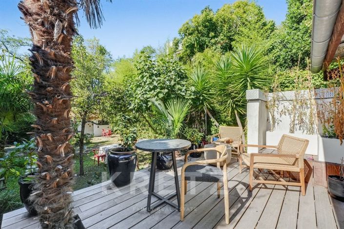 In the garden, laid out to preserve everyone's privacy, with independent access: 1 contemporary wooden outbuilding of 65m2 divided into 2 studios, a first 31m2 with a small terrace (studio, short-term rental or guest house), and a second studio of about 44m2 (currently office / workspace, with a WC), the latter is expandable and suitable for a liberal profession or other project.