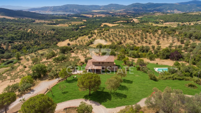 On a hill in the Lake Trasimeno area, in a setting of notable landscape interest just 15 km from Panicale and the main services, Casale del Pozzo is reached via 2.4 km of unpaved road; the first amenities are only a 10-minute drive away. The position is private and peaceful, with southern exposure ensuring constant natural light. The view opens onto the Umbrian hills, the garden, the swimming pool and the surrounding woodland, offering wide and uninterrupted vistas.