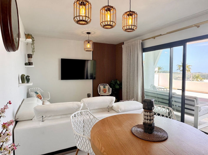 The apartment offers a sleek open-plan kitchen that flows effortlessly into the bright living and dining area, creating a modern and sociable living space. Large sliding doors open onto a generous terrace with panoramic views across the nearby golf course and the Mediterranean Sea.