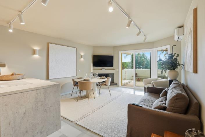 This exceptional 3-bedroom, 2-bathroom luxury apartment is located in the highly sought-after Calahonda Golf community, set in the heart of a picturesque 9-hole golf course. Recently refurbished to the highest standards, the property showcases a sophisticated Japandi design, blending clean Scandinavian lines with warm