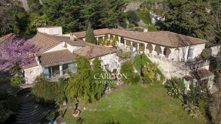 In a quiet and residential environment, beautiful property offering a clear view of the surrounding hills, sheltered from view while being close to amenities. Nestled on a large land of 3,555 m² adorned with an olive grove and a swimming pool, this 320m² single-story Florentine style villa and an independent guest house. It consists of a living room with a fireplace open to an interior patio bordered by Italian arches, a kitchen open to the dining room, a double living room with a fireplace, a dining room, three en-suite bedrooms, and an office.Independant 2 rooms apartment. A true corner of paradise.