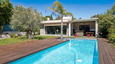 Beautiful contemporary single-storey villa, about 230 m² of living space, 4 suites each with their own bathroom, high-quality fittings, landscaped garden, swimming pool, flat plot of around 1200 m², garage, in a dead-end street for total quiet, 5 minutes from amenities and the sea.