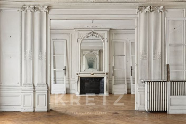 A grand family and reception apartment in need of full renovation of 260sqm. Exceptional volumes with 3.60m ceiling heights. Original period features throughout: herringbone parquet floors, ornate mouldings, fireplaces.