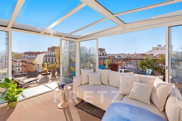 It benefits from an exceptional 200m² terrace, landscaped and unfenced, featuring a sunroom-veranda and an summer kitchen. The rooftop offers a panoramic view of Paris with the Eiffel Tower and Montmartre.