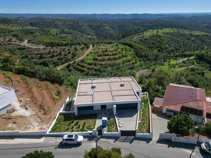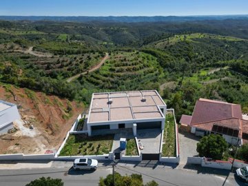This contemporary 4-bedroom villa, filled with natural light and designed with modern living in mind, enjoys breathtaking countryside and coastal views from its elevated position in Monchique. Upon entering the property, you are welcomed by a spacious entrance hall that immediately captures the panoramic country and coastline vistas. On this level, there are three generously sized en-suite bedrooms, all thoughtfully designed with fitted wardrobes. Also, on this level there is access to the large double garage for convenience. The lower level showcases an impressive open-plan kitchen, dining, and living area. The double-height ceiling and expansive windows flood the space with natural light, creating a bright and airy atmosphere. This level also features the master en-suite bedroom, a utility room, and a separate preparation kitchen. Large sliding doors provide seamless access to the outdoor entertaining area, where youll find a swimming pool with a built-in relaxation space, perfect for enjoying al fresco dining while taking in the stunning surroundings. Additional features include air conditioning throughout and carefully considered design elements that enhance comfort and functionality. A truly exceptional family home combining contemporary style, space, and spectacular views.