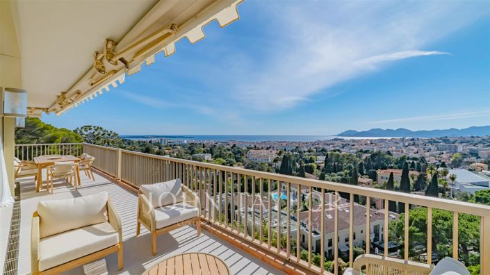 Located on the top floor of a luxury residence, this magnificent apartment benefits from a fabulous sea view over the Bay of Cannes, the Estérel and the hills of the hinterland, as well as a large corner terrace of 77 m² facing south, east, and west.