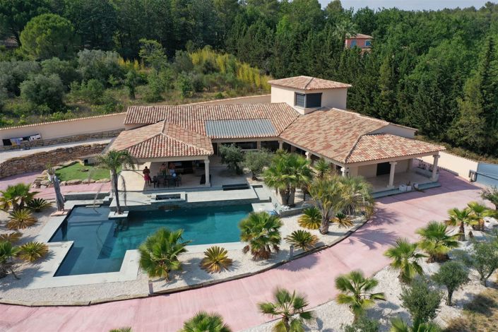 Just minutes from the historic village center of Lorgues... Located in a quiet residential neighborhood... Rare property totaling approximately 650/680 m2 of living space with a chic Provençal world-house vibe on 4000 m2 of landscaped land, crowned by an entrance gate lined with countless Mediterranean palm trees weaving along the main driveway between the pool, the main villa, and the guest house... The Main Villa of about 250 m2 of living space comprises: an entrance leading directly to the large cathedral-like south-facing living room opening onto the terrace and pool... In continuity, a wall adorned with immense columns elegantly concealing a spacious fully-equipped kitchen, worthy of a bistronomic restaurant that will please discerning cooks, capable of hosting countless guests with ease... An adjoining corridor from the living room consists of three suites, one of which has direct access to its terrace and pool... A guest WC and dressing room complete the ground-floor layout... Upstairs, an independent suite with a shower room and WC... The pool with integrated jacuzzi stands as the centerpiece between the dwelling and the large tiled terrace... A Guest House of about 70 m2 / type F3 with terrace: Direct entry to the living room (high ceilings), fully equipped American kitchen, 2 bedrooms, a shower room, WC... For those with multiple vehicles to secure; a huge basement of about 360 m2 comprising a large garage to accommodate 5/6 vehicles... It continues with a wine cellar, a laundry room (fully equipped), storage rooms, including a particularly large room of about 80 m2 capable of receiving 2 additional cars or any other uses you may design: gym, wellness, games room, office... The villa is equipped with reversible underfloor heating (hot & cold). Possibility to accommodate more than 20 vehicles... Amenities: Heart of Lorgues Village 5 minutes, TGV Gare des Arcs 20 minutes, Nice Airport 1h30, Highway 25 minutes, Neighboring high-quality villas. Acquisition for a peaceful haven in the mode of: primary family residence, secondary residence with potential rental income. Sold with most of the furnishings. + Possibility to acquire adjacent natural land +3000 m2 (subject to conditions). DPE Villa A / Guest House B.