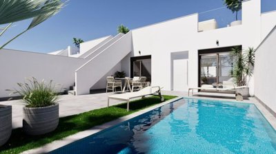 We are pleased to present this spectacular 2-bedroom villa located in the ‘El Alba’ residential complex in Roldan, Torre Pacheco. This charming property features a modern and functional design that maximizes space and natural light. The property boasts a stunning private pool, perfect for enjoying the Mediterranean climate year-round. The interiors are finished with high-quality materials and offer comfortable bedrooms alongside spacious common areas perfect for gatherings with family or friends. Additionally, its strategic location provides easy access to local amenities such as supermarkets, restaurants, and recreational areas, as well as quick connections to major roads leading to nearby cities and sports facilities.