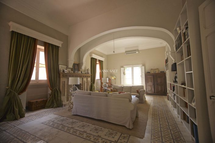 An imposing fully detached PALAZZO having been restored and converted to provide luxury accommodation in the centre of this town alongside with other prestigious imposing ‘Period Residences’. This Art Nouveau style residence boasts of bright and spacious interiors that still enjoy original characteristics including a welcoming foyer with patterned floor tiles, high ceilings and a decorative leaded glass window feature. Downstairs accommodation includes a double reception room with functional fireplace, drawing room, dining room, fully fitted island kitchen with a larder and an adjacent breakfast room and guest toilet. On the first floor, one finds 4 double bedrooms - the main bedroom has a dressing room, 2 ensuite bathrooms, main bathroom with shower and a service kitchen with washroom. Two separate spiral staircases connect the ground floor up to roof level where there is a self-contained one bedroom flatlet leading onto an open roof terrace. The outdoor area includes a large front garden with 3 fountains, driveway leading to a lock-up garage and side garden with planters surrounds the property. This property is built on a land measuring approximately 782sqm and has a built-up footprint of 320sqm.