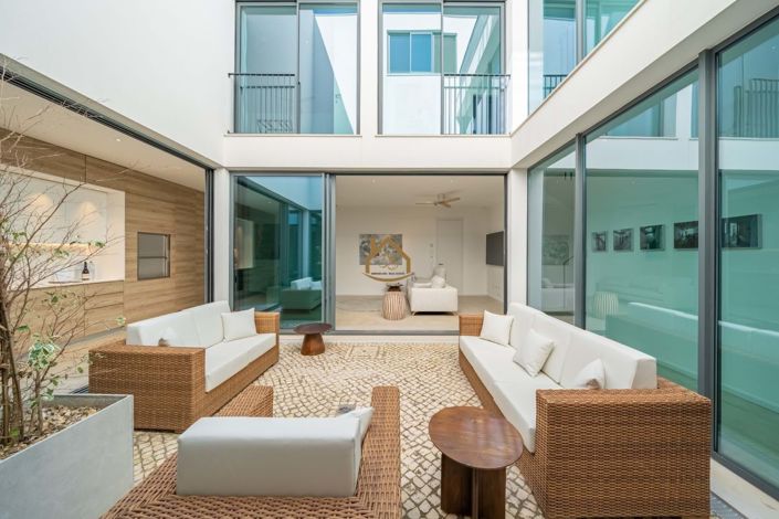 The adjacent dining and living areas are bordered by a central courtyard where the large, floor-to-ceiling terrace doors flood the space with natural light, creating a seamless connection to the outdoor space.