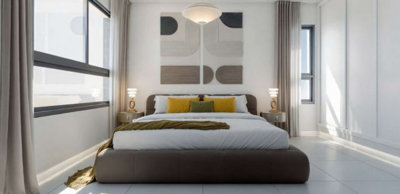 Interior finishes include porcelain flooring, built-in wardrobes, and automated blinds in both bedrooms and living areas, providing comfort and modern convenience.