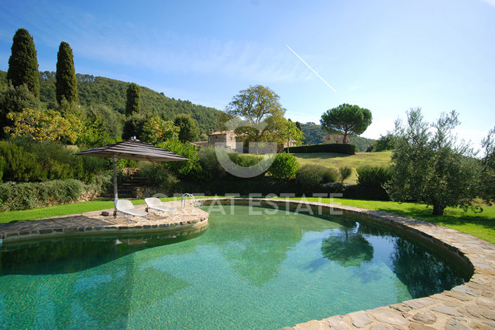 This exquisite 710-sqm villa in the heart of Tuscany blends rustic charm with re...
